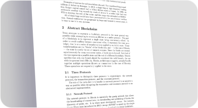to extract OCaml code from proofs. As Tezos matures, it will be possible to automatically extract key parts of the protocol’s code from mathematical proofs of correctness. Examplesofspectacularsoftware failure abound. The heartbleed bug caused millions of dollars in damages. In 2013, a single bug at high-frequency trading firm Knight capital caused half a billion dollars worth of losses. In 1996, an arithmetic overflow bug caused the crash of Ariane 5, a rocket that had cost $7B to develop; the cost of the rocket and the cargo was estimated at $500M. All of these bugs could have been prevented with the use of formal verifica- tion. Formal verification has progressed by leaps and bounds in recent years, it is time to use it in real systems. 2 Abstract Blockchains Tezos attempts to represent a blockchain protocol in the most general way possible while attempting to remain as efficient as a native protocol. The goal of a blockchain is to represent a single state being concurrently edited. In order to avoid conflicts between concurrent edits, it represents the state as a ledger, that is as a series of transformations applied to an initial state. These transformations are the “blocks” of the blockchain, and — in the case of Bitcoin —the state is mostly the set of unspent outputs. Since the blocks are created asynchronously by many concurrent nodes, a block tree is formed. Each leaf of the tree represents a possible state and the end of a different blockchain. Bitcoin specifies that only one branch should be considered the valid branch: the one with the greatest total difficulty. Blocks, as their name suggests, actually bundle together multiple operations (known as transactions in the case of Bitcoin). These operations are sequentially applied to the state. 2.1 Three Protocols It is important to distinguish three protocols in cryptoledgers: the network protocol, the transaction protocol, and the consensus protocol. The role of the meta shell is to handle the network protocol in as agnostic a way as possible while delegating the transaction and consensus protocol to an abstracted implementation. 2.1.1 Network Protocol The network protocol in Bitcoin is essentially the gossip network that allows the broadcasting of transactions, the downloading and publishing of blocks, the discovery of peers, etc. It is where most development occurs. For instance, bloom filters were introduced in 2012 through BIP0037 to speed up the simple payment verification for clients which do not download the whole blockchain. Changes to the network protocol are relatively uncontroversial. There may be initial disagreements on the desirability of these changes, but all parties interests are fundamentally aligned overall. 10