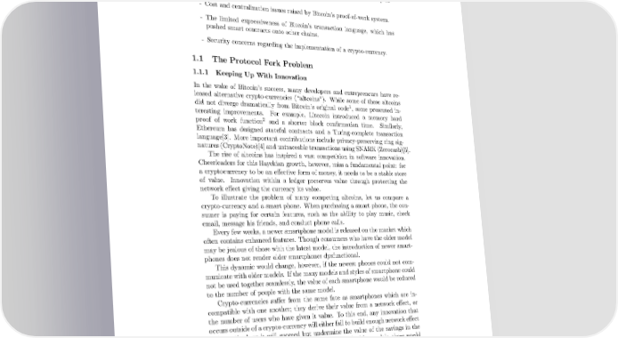 - The “hard fork” problem, or the inability for Bitcoin to dynamically in- novate due to coordination issues. - Cost and centralization issues raised by Bitcoin’s proof-of-work system. - The limited expressiveness of Bitcoin’s transaction language, which has pushed smart contracts onto other chains. - Security concerns regarding the implementation of a crypto-currency. 1.1 The Protocol Fork Problem 1.1.1 Keeping Up With Innovation In the wake of Bitcoin’s success, many developers and entrepreneurs have re- leased alternative crypto-currencies (“altcoins”). While some of these altcoins did not diverge dramatically from Bitcoin’s original code1, some presented in- teresting improvements. For example, Litecoin introduced a memory hard 2 proof of work function and a shorter block confirmation time. Similarly, Ethereum has designed stateful contracts and a Turing-complete transaction language[3]. More important contributions include privacy-preserving ring sig- natures(CryptoNote)[4]anduntraceabletransactionsusingSNARK(Zerocash)[5]. The rise of altcoins has inspired a vast competition in software innovation. Cheerleaders for this Hayekian growth, however, miss a fundamental point: for a cryptocurrency to be an effective form of money, it needs to be a stable store of value. Innovation within a ledger preserves value through protecting the network effect giving the currency its value. To illustrate the problem of many competing altcoins, let us compare a crypto-currency and a smart phone. When purchasing a smart phone, the con- sumer is paying for certain features, such as the ability to play music, check email, message his friends, and conduct phone calls. Every few weeks, a newer smartphone model is released on the market which often contains enhanced features. Though consumers who have the older model maybejealous of those with the latest model, the introduction of newer smart- phones does not render older smartphones dysfunctional. This dynamic would change, however, if the newest phones could not com- municate with older models. If the many models and styles of smartphone could not be used together seamlessly, the value of each smartphone would be reduced to the number of people with the same model. Crypto-currencies suffer from the same fate as smartphones which are in- compatible with one another; they derive their value from a network effect, or the number of users who have given it value. To this end, any innovation that occurs outside of a crypto-currency will either fail to build enough network effect to be noticed, or it will succeed but undermine the value of the savings in the old currency. If smartphones were incompatible with older models, there would 1wow, such unoriginal 2scrypt mining ASICs are now available 3