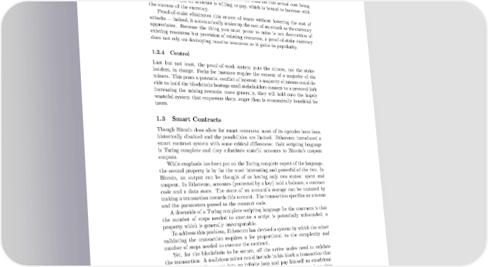 system in the hands of ghash.io. The very security of a proof-of-work scheme rests on this actual cost being higher than what an attacker is willing to pay, which is bound to increase with the success of the currency. Proof-of-stake eliminates this source of waste without lowering the cost of attacks —indeed, it automatically scales up the cost of an attack as the currency appreciates. Because the thing you must prove to mine is not destruction of existing resources but provision of existing resources, a proof-of-stake currency does not rely on destroying massive resources as it gains in popularity. 1.2.4 Control Last but not least, the proof-of-work system puts the miners, not the stake- holders, in charge. Forks for instance require the consent of a majority of the miners. This poses a potential conflict of interest: a majority of miners could de- cide to hold the blockchain hostage until stakeholders consent to a protocol fork increasing the mining rewards; more generally, they will hold onto the hugely wasteful system that empowers them longer than is economically beneficial for users. 1.3 Smart Contracts Though Bitcoin does allow for smart contracts, most of its opcodes have been historically disabled and the possibilities are limited. Ethereum introduced a smart contract system with some critical differences: their scripting language is Turing complete and they substitute stateful accounts to Bitcoin’s unspent outputs. While emphasis has been put on the Turing complete aspect of the language, the second property is by far the most interesting and powerful of the two. In Bitcoin, an output can be thought of as having only two states: spent and unspent. In Ethereum, accounts (protected by a key) hold a balance, a contract code and a data store. The state of an account’s storage can be mutated by makingatransaction towards this account. The transaction specifies an amount and the parameters passed to the contract code. Adownside of a Turing complete scripting language for the contracts is that the number of steps needed to execute a script is potentially unbounded, a property which is generally uncomputable. Toaddress this problem, Ethereum has devised a system by which the miner validating the transaction requires a fee proportional to the complexity and number of steps needed to execute the contract. Yet, for the blockchain to be secure, all the active nodes need to validate the transaction. A malicious miner could include in his block a transaction that he crafted specially to run into an infinite loop and pay himself an exorbitant fee for validating this transaction. Other miners could waste a very long time validating this transaction. Worse, they could just slack and fail to validate it. 8