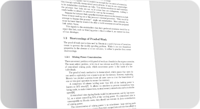 Even assuming the likely benevolence of a core development team, it represents a weak point on which an attacker could exercise leverage. Tezos guards against the vulnerabilities wrought by the source of centraliza- tion through radically decentralized protocol forks. It uses its own cryptoledger to let stakeholders coordinate on forks. This allows coordination and enshrines the principle that forks are not valid unless they are endogenous, making it much harder to attack the protocol by moving the consensus. Supposeforinstancethatapopulardeveloperannounceshisintentiontofork Tezos without making use of the protocol’s internal procedure. “Why would he attempt to bypass this process?” might ask stakeholders. Most certainly, be- cause he knew that he wouldn’t be able to build consensus around his proposed fork within Tezos. This signals to the stakeholders that their preferred consensus would be to reject this fork, and the Schelling point is thus to refuse it, no matter the clout of that developer. 1.2 Shortcomings of Proof-of-Work The proof-of-work mechanism used by Bitcoin is a careful balance of incentives meant to prevent the double spending problem. While it has nice theoretical properties in the absence of miner collusion, it suffers in practice from severe shortcomings. 1.2.1 Mining Power Concentration Thereareseveralproblemswithproof-of-workasafoundationforcrypto-currencies. The most salient problem, which is all too relevant as of 2014, is the existence of centralized mining pools, which concentrate power in the hands of a few individuals. The proof-of-work mechanism is decentralized, which means that users do not need to explicitely trust anyone to secure the currency. However, implicitely, Bitcoin has yielded a system where all users have to trust the benevolence of one or two pool operators to secure the currency. A conspiracy of miners holding more than 50% of the hashing power is known as 51% attack[7]. It allows the attackers to prevent transactions from beingmade,toundotransactions, tostealrecentlymintedcoinsandtotodouble spend[8]. Acentralized mint signing blocks would be just as secure, and far less waste- ful, as a miner controlling 51% of the hashing power. If a centralized mint is unacceptable to Bitcoin users, they should not tolerate de facto centralization of mining power. The concentration of mining power is no coincidence: large mining pools face less variance in their returns than their competitors and can thus afford to grow their operation more. In turn, this growth increases their market share and lowers their variance. 5