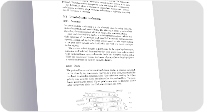 Fourth quarter Assuming the amendment was approved, it will have been running in the testnet since the beginning of the third quarter. The stakeholders vote a second time to confirm they wish to promote the test protocol to the main protocol. This also requires the quorum to be met and an 80% supermajority. We deliberately chose a conservative approach to amendments. However, stakeholders are free to adopt amendments loosening or tightening this policy should they deem it beneficial 3.2 Proof-of-stake mechanism 3.2.1 Overview Our proof-of-stake mechanism is a mix of several ideas, including Slasher[1], chain-of-activity[2], and proof-of-burn. The following is a brief overview of the algorithm, the components of which are explained in more details below. Each block is mined by a random stakeholder (the miner) and includes mul- tiple signatures of the previous block provided by random stakeholders (the signers). Mining and signing both offer a small reward but also require making a one year safety deposit to be forfeited in the event of a double mining or double signing. Theprotocol unfolds in cycles of 2048 blocks. At the beginning of each cycle, a random seed is derived from numbers that block miners chose and committed to in the penultimate cycle, and revealed in the last. Using this random seed, a follow the coin strategy is used to allocate migning rights and signing rights to a specific addresses for the next cycle. See figure 1. 3.2.2 Clock The protocol imposes minimum delays between blocks. In principle, each block can be mined by any stakeholder. However, for a given block, each stakeholder is subject to a random minimum delay. The stakeholder receiving the highest priority may mine the block one minute after the previous block. The stake- holder receiving the second highest priority may mine the block two minutes after the previous block, the third, three minutes, and so on. Figure 1: Four cycles of the proof-of-stake mechanism 10