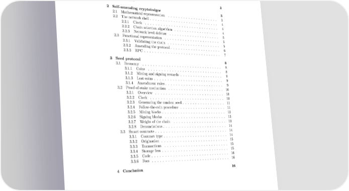 Contents 1 Introduction 3 2 Self-amending cryptoledger 3 2.1 Mathematical representation . . . . . . . . . . . . . . . . . . . . 3 2.2 The network shell . . . . . . . . . . . . . . . . . . . . . . . . . . . 4 2.2.1 Clock . . . . . . . . . . . . . . . . . . . . . . . . . . . . . 4 2.2.2 Chain selection algorithm . . . . . . . . . . . . . . . . . . 4 2.2.3 Network level defense . . . . . . . . . . . . . . . . . . . . 5 2.3 Functional representation . . . . . . . . . . . . . . . . . . . . . . 5 2.3.1 Validating the chain . . . . . . . . . . . . . . . . . . . . . 5 2.3.2 Amending the protocol . . . . . . . . . . . . . . . . . . . . 6 2.3.3 RPC . . . . . . . . . . . . . . . . . . . . . . . . . . . . . . 7 3 Seed protocol 8 3.1 Economy . . . . . . . . . . . . . . . . . . . . . . . . . . . . . . . 8 3.1.1 Coins . . . . . . . . . . . . . . . . . . . . . . . . . . . . . 8 3.1.2 Mining and signing rewards . . . . . . . . . . . . . . . . . 8 3.1.3 Lost coins . . . . . . . . . . . . . . . . . . . . . . . . . . . 9 3.1.4 Amendment rules . . . . . . . . . . . . . . . . . . . . . . . 9 3.2 Proof-of-stake mechanism . . . . . . . . . . . . . . . . . . . . . . 10 3.2.1 Overview . . . . . . . . . . . . . . . . . . . . . . . . . . . 10 3.2.2 Clock . . . . . . . . . . . . . . . . . . . . . . . . . . . . . 10 3.2.3 Generating the random seed . . . . . . . . . . . . . . . . . 11 3.2.4 Follow-the-coin procedure . . . . . . . . . . . . . . . . . . 11 3.2.5 Mining blocks . . . . . . . . . . . . . . . . . . . . . . . . . 13 3.2.6 Signing blocks . . . . . . . . . . . . . . . . . . . . . . . . 13 3.2.7 Weight of the chain . . . . . . . . . . . . . . . . . . . . . 13 3.2.8 Denunciations . . . . . . . . . . . . . . . . . . . . . . . . . 14 3.3 Smart contracts . . . . . . . . . . . . . . . . . . . . . . . . . . . . 14 3.3.1 Contract type . . . . . . . . . . . . . . . . . . . . . . . . . 14 3.3.2 Origination . . . . . . . . . . . . . . . . . . . . . . . . . . 15 3.3.3 Transactions . . . . . . . . . . . . . . . . . . . . . . . . . 15 3.3.4 Storage fees . . . . . . . . . . . . . . . . . . . . . . . . . . 15 3.3.5 Code . . . . . . . . . . . . . . . . . . . . . . . . . . . . . . 16 3.3.6 Fees . . . . . . . . . . . . . . . . . . . . . . . . . . . . . . 16 4 Conclusion 16 2