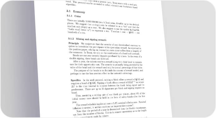 3 Seed protocol Much like blockchains start from a genesis hash, Tezos starts with a seed pro- tocol. This protocol can be amended to reflect virtually any blockchain based algorithm. 3.1 Economy 3.1.1 Coins There are initially 10000000000 (ten billion) coins, divisible up to two decimal places. We suggest that a single coin be referred to as a “tez” and that the smallest unit simply as a cent. We also suggest to use the symbol ꜩ (\ua729, “Latin small letter tz”) to represent a tez. Therefore 1 cent = ꜩ0.01 = one hundreth of a tez. 3.1.2 Mining and signing rewards Principle We conjecture that the security of any decentralised currency re- quires to incentivize the participants with a pecuniary reward. As explained in the position paper, relying on transaction costs alone suffers from a tragedy of the commons. In Tezos, we rely on the combination of a bond and a reward. Bonds are one year security deposits purchased by miners. In the event of a double signing, these bonds are forfeited. After a year, the miners receive a reward along with their bond to compen- sate for their opportunity cost. The security is primarily being provided by the value of the bond and the reward need only be a small percentage of that value. The purpose of the bonds is to diminish the amount of reward needed, and perhaps to use the loss aversion effect to the network’s advantage. Specifics In the seed protocol, mining a block offers a reward of ꜩ512 and requires a bond of ꜩ1536. Signing a block offers a reward of 32∆T−1 tez where ∆T is the time interval in minutes between the block being signed and its predecessor. There are up to 16 signatures per block and signing requires no bond. Thus, assuming a mining rate of one block per minute, about 8% of the initial money mass should be held in the form of safety bonds after the first year. Therewardschedule implies at most a 5.4% nominal inflation rate. Nominal 2 inflation is neutral, it neither enrishes nor impoverishes anyone . Note that the period of a year is determined from the block’s timestamps, not from the number of blocks. This is to remove uncertainty as to the length of the commitment made by miners. 2 In contrast, Bitcoin’s mining inflation impoverishes Bitcoin holders as a whole, and central banking enrishes the financial sector at the expense of savers 8